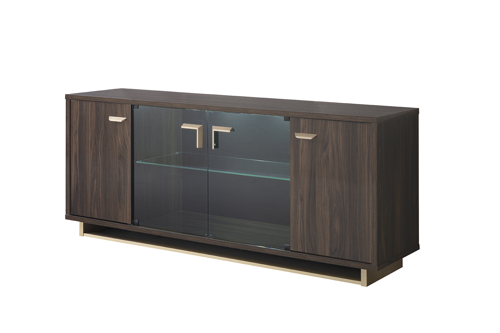 Volare Walnut 4 Door Sideboard offers plenty of internal storage space for storing away everything from plates and crockery to glassware and the like. Designed using quality walnut high gloss finish with original triangle cut handles in bleached, satin and brushed gold finish with matching plinths and internal led lights provide a focal point in any dining or living room. Also this sideboard has spacious top surface prove useful as it provides space to place vases, lamps, ornaments and more.