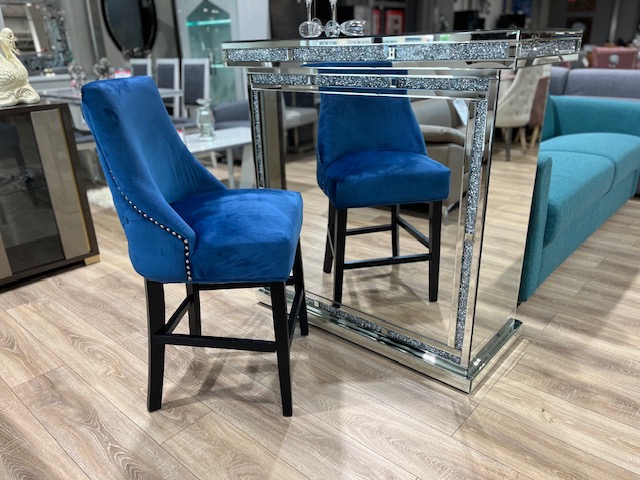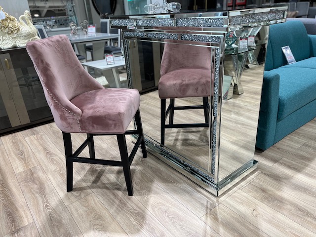 This beautiful pink velvet fabric bar/breakfast stool is in the clearance sale reduced from $495 right down to $150…. YES… $150. Its contemporary design and modern look will make this the perfect choice for your living space. This velvet fabric stool is made to the highest standards using only the finest materials, the seat has serpentine springing unit coupled with a elasticated high resilience webbing on tipple layer medium density polyurethane foams giving it strength and delivering a super comfort sit. Finished with solid wood legs finished in dark oak varnish. GET THIS BEFORE ITS GONE, LAST FEW PIECES ON DISPLAY SOLD AS SEEN. COLLECTION FROM STORE.