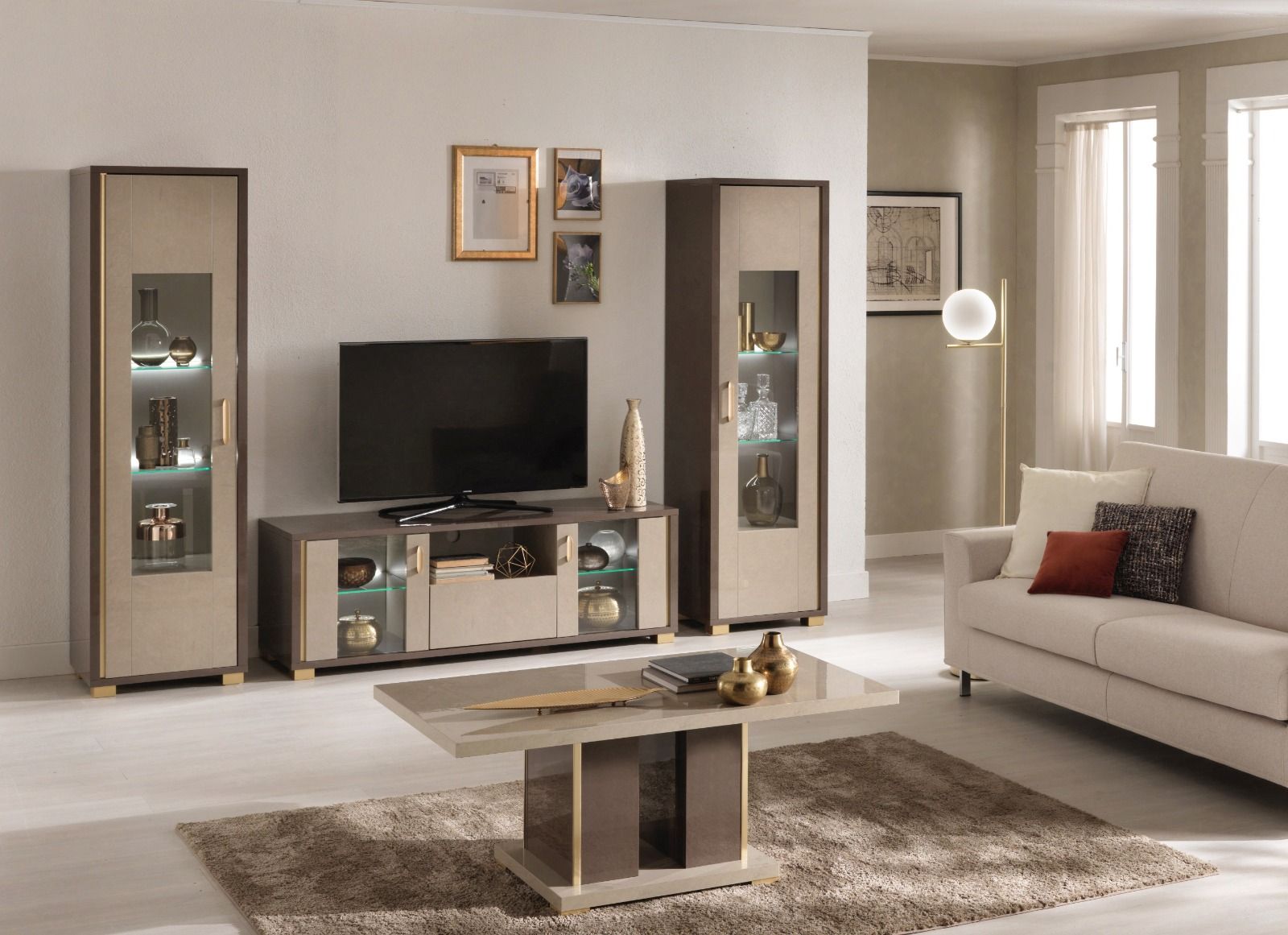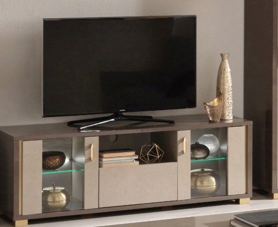 Cesar TV Unit is elegant, sand beige finish door fronts with contrasting brown effect top and side panels and golden frame work and handle and LED lighting, so you can enjoy in style. It features two cabinets and a pair of open shelves for tucking away DVDs, video games, and more, while cable management cut-outs help stop wires from taking over.