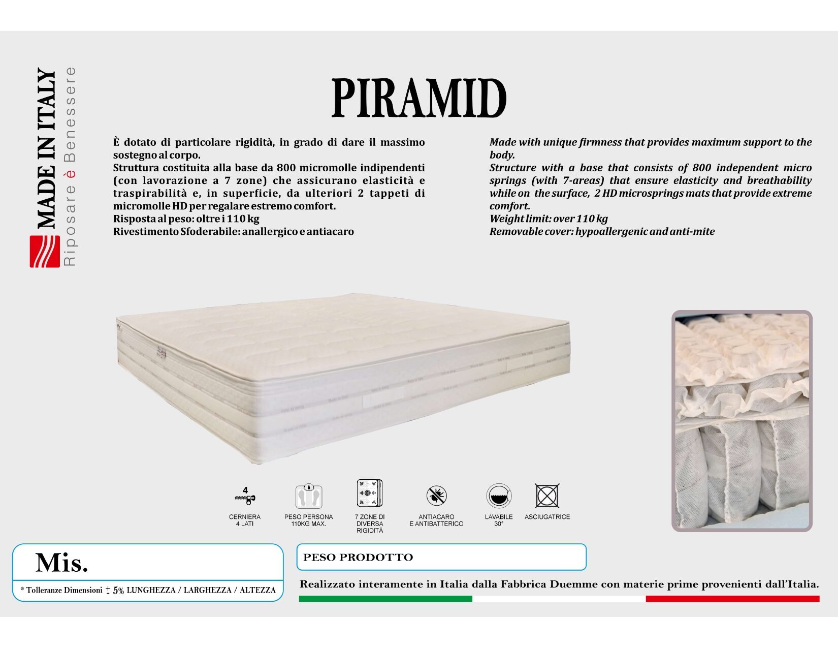 ✅ SPRING : It is made up of 800 independent micro-springs in different areas which ensure load-bearing support according to the stresses made by the various parts of the body and a surface layer of self-adaptable Memory Foam.