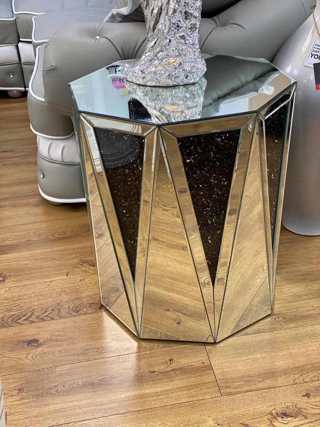 • Mirrored finish side table: smooth mirror glass panels, the interior is inlaid with diamonds.
