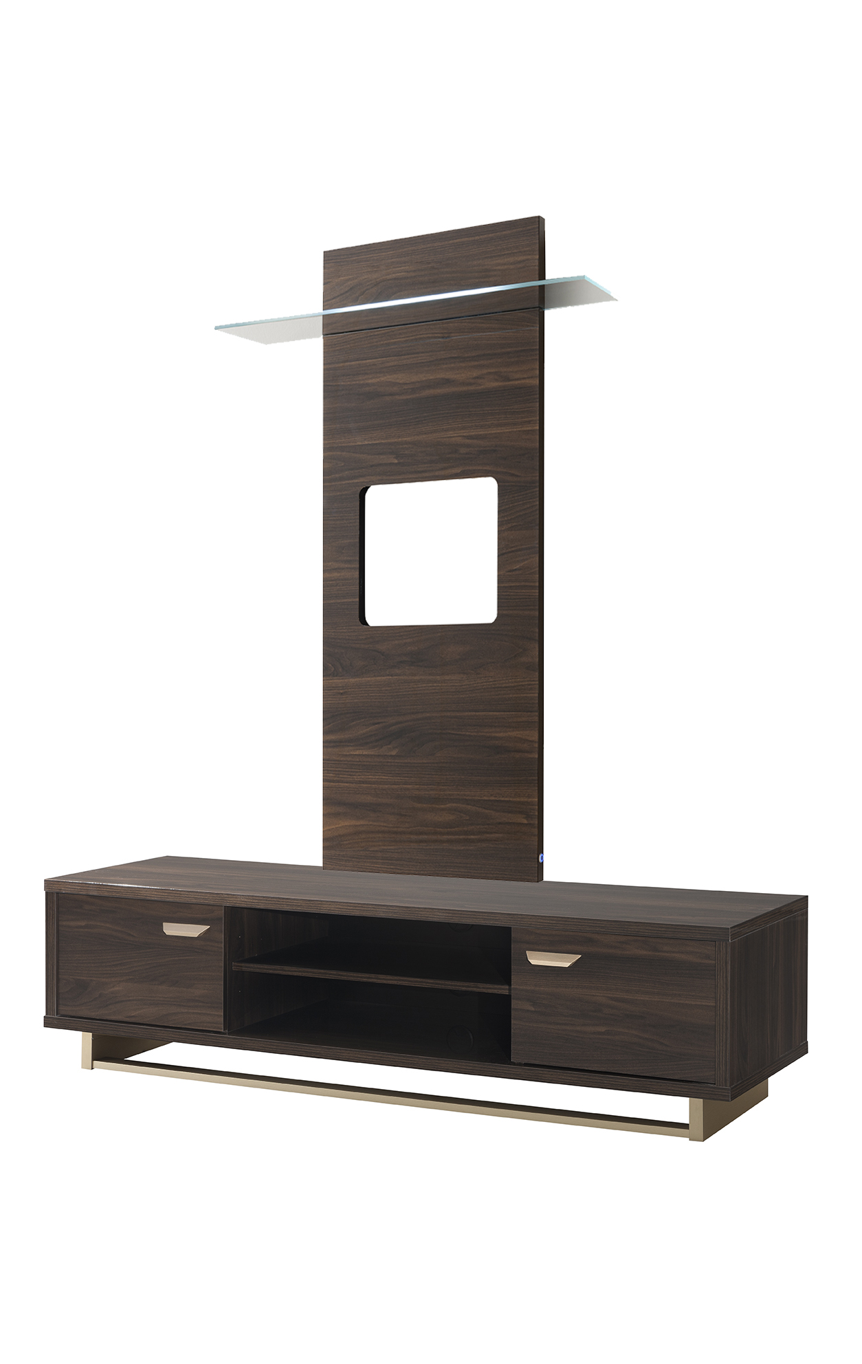 Volare Walnut TV Wall Panel provides you with all of the room you need to store all of your media and entertainment devices. Designed using quality walnut high gloss finish and internal led lights to give a classic style design to your living space. Its open glass shelves spaces and holes for easy wire management were specially designed to meet today’s electronic equipment needs.