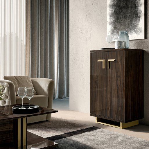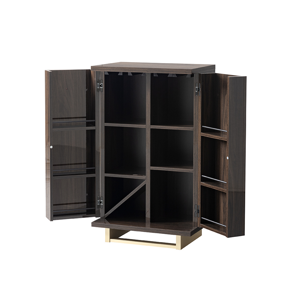 Volare Walnut 2 Door Bar Unit will add a majestic touch to your home, and will be a major focal point in your bedroom or dining room. Designed using quality walnut high gloss finish with original triangle cut handles in bleached, satin and brushed gold finish with matching plinths. The Adjustable internal shelves; customizable wine cellar inclined separator panel. Custom under top profiles allow for different glass size and shape storage.